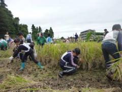 6月12日の田植え以来です。この間に稲もずいぶん大きくなりました。田植えを振り返っての感想は、『大変だったけど楽しかった』『後ろに進むのがむずかしかった』『稲を3~4本取り分けるのがむずかしかった』『足が田んぼに埋まって転びそうになった』など。いい経験ができた様子。
