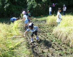 各グループ、稲を刈る、刈った稲をはさ掛けするために運ぶ、と二手に分かれスタートです。