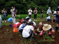 昨日の雨で畑の土は湿っています。実行委員が先に畝にクワを入れ、ジャガイモを掘り出しやすくしました。