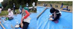 その後、すり鉢に籾を入れ、ボールをつかってもみ殻を取ります。ここで玄米となり、その後ペットボトルに入れ、棒でついて精米しますが、時間切れ・・
