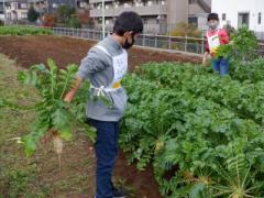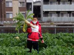 農場へ移動し、自分が種を蒔いた大根5本のうち2本選んで収穫しました。
