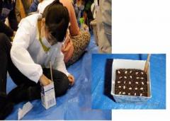 その後、さっそくお米作りの第1歩、種まきをしました。各自持参した牛乳パックに5㎝のところまで平らになるように土を入れ、霧吹きで水分を含ませたところに、25粒の種を並べたね。そしてその上に2㎝位土をかぶせ、もう1回水を含ませ終了!