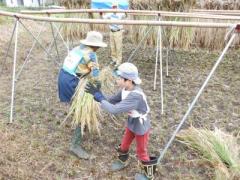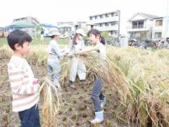 各G稲を刈る人、稲架(はせ)まで運ぶ人の二手に分かれ、実行委員は刈った稲を束ねていきます。