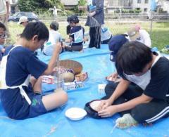 すり鉢とボールを使いました。これが結構大変で「疲れたあ」という声が毎年聞かれるのですが、今年はそういう声もなく、みんなドンドンやっていました。
