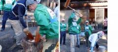 はじめに蒸かしたもち米を臼にあけますがすぐにはつきません。まずは実行委員がお米をつぶすようにこねていきます。そして最初は大きな杵でつき、みんながつきやすいようにします。