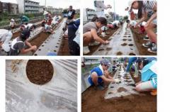 マルチの穴の中に1㎝間隔で3角形になるように種を置き、その後土をそっと戻して平になるようにして下さい。土は固まっているのでほぐして下さいね。